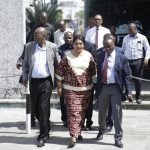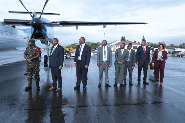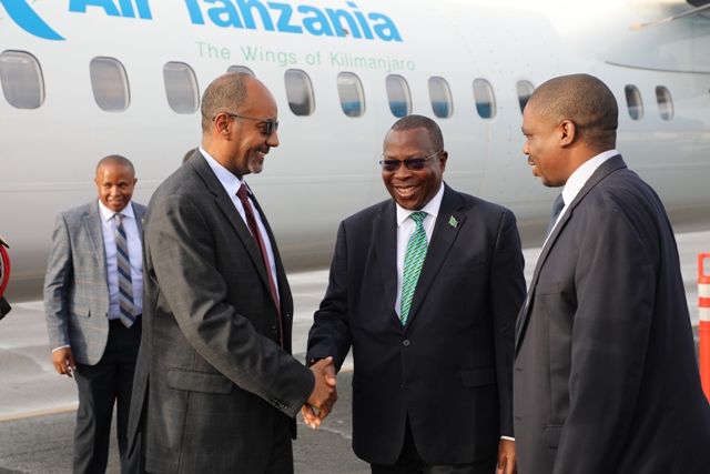 Waziri wa Fedha na Mipango Mhe. Dkt. Philip Isdor Mpango (wa pili kushoto) akiongoza ujumbe wa Tanzania kumpokea Rais wa Benki ya Biashara na Maendeleo ya Mashariki na Kusini mwa Afrika (TDB), Dkt. Admassu Tadesse alipowasili Uwanja wa Ndege Jijini Dodoma.