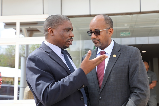 Katibu Mkuu wa Wizara ya Fedha na Mipango Bw. Doto James akiteta jambo na Rais wa Benki ya Biashara na Maendeleo Mashariki na Kusini mwa Afrika (TDB) Dkt. Admassu Tadesse, Ikulu ya Chamwino mkoani Dodoma baada ya kumalizika kwa mkutano kati ya Rais huyo na Rais wa Tanzania Dkt. John Magufuli.
