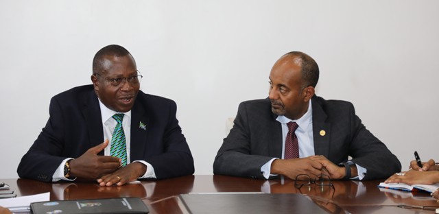 Waziri wa Fedha na Mipango Mhe. Dkt. Philip Isdor Mpango (Mb) (kushoto) akizungumza wakati wa mkutano wake na Rais wa Benki ya Biashara na Maendeleo Mashariki na Kusini mwa Afrika (TDB), Dkt. Admassu Tadesse (kulia), Jijini Dodoma.