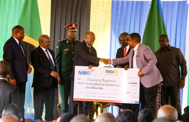 Rais wa Jamhuri ya Muungano wa Tanzania Mhe Dkt John Pombe Magufuli akipokea kutoka kwa Kaimu Mkurugenzi Mkuu wa TMDA Dkt. Danstan Hipolite na Mwenyekiti wa Bodi ya Ushauri ya Wizara, Balozi Dkt. Ben Moses hundi ya mfano ya Tzs bil 12.475 ikiwa ni mchango kwa Serikali Kuu wakati wa hafla ya kupokea gawio na michango kutoka mashirika na taasisi za Umma iliyofanyika Ikulu Chamwino Jijini Dodoma tarehe 24 Novemba 2019. Kushoto ni Mhe. Waziri wa Fedha na Mipango, Dkt. Phillip Mpango na Spika wa Bunge Mhe. Job Ndugai (Mb).