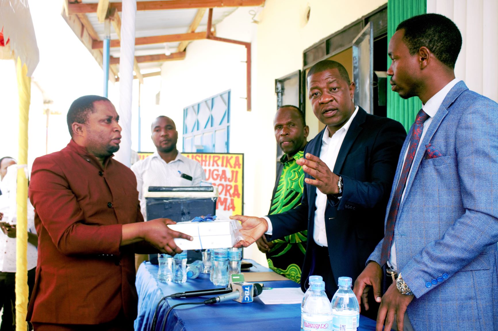 Naibu waziri wa Mifugo na Uvuvi Mhe. Abdallah Ulega ,akipokea risala kutoka kwa Mwenyekiti wa chama cha wafugaji wa kuku bora Dodoma (CHAWAKUBODO) Bw.Pius Mushi wakati wa kukaabidhi chanjo ya mdondo kwa Chama cha Ushirika wa Wafugaji Kuku Bora Jiji la Dodoma (CHAWAKUBODO).