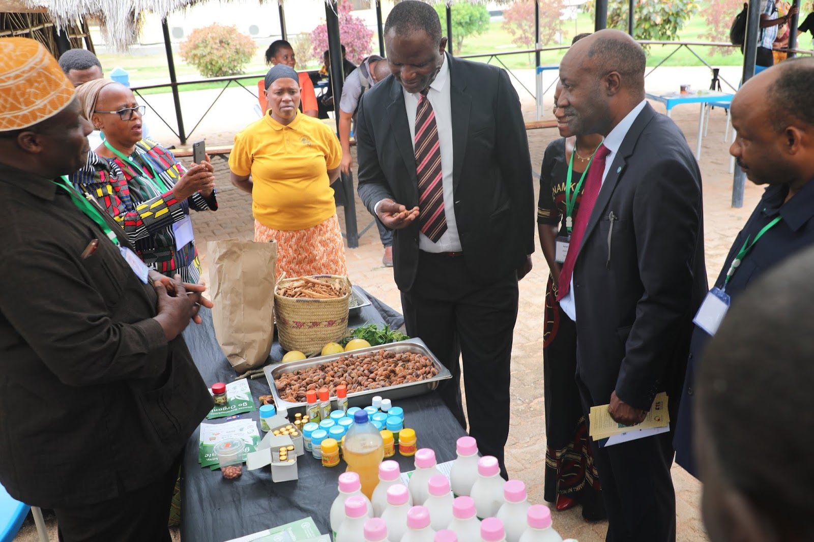 Waziri wa Kilimo Mhe Japhet Hasunga (Mb) akikagua baadhi ya bidhaa za wajasiriamali wakati wa hafla ya uzinduzi wa kongamano la kitaifa la kilimo-hai la siku mbili linalofanyika Jijini Dodoma tarehe 26 Novemba 2019.