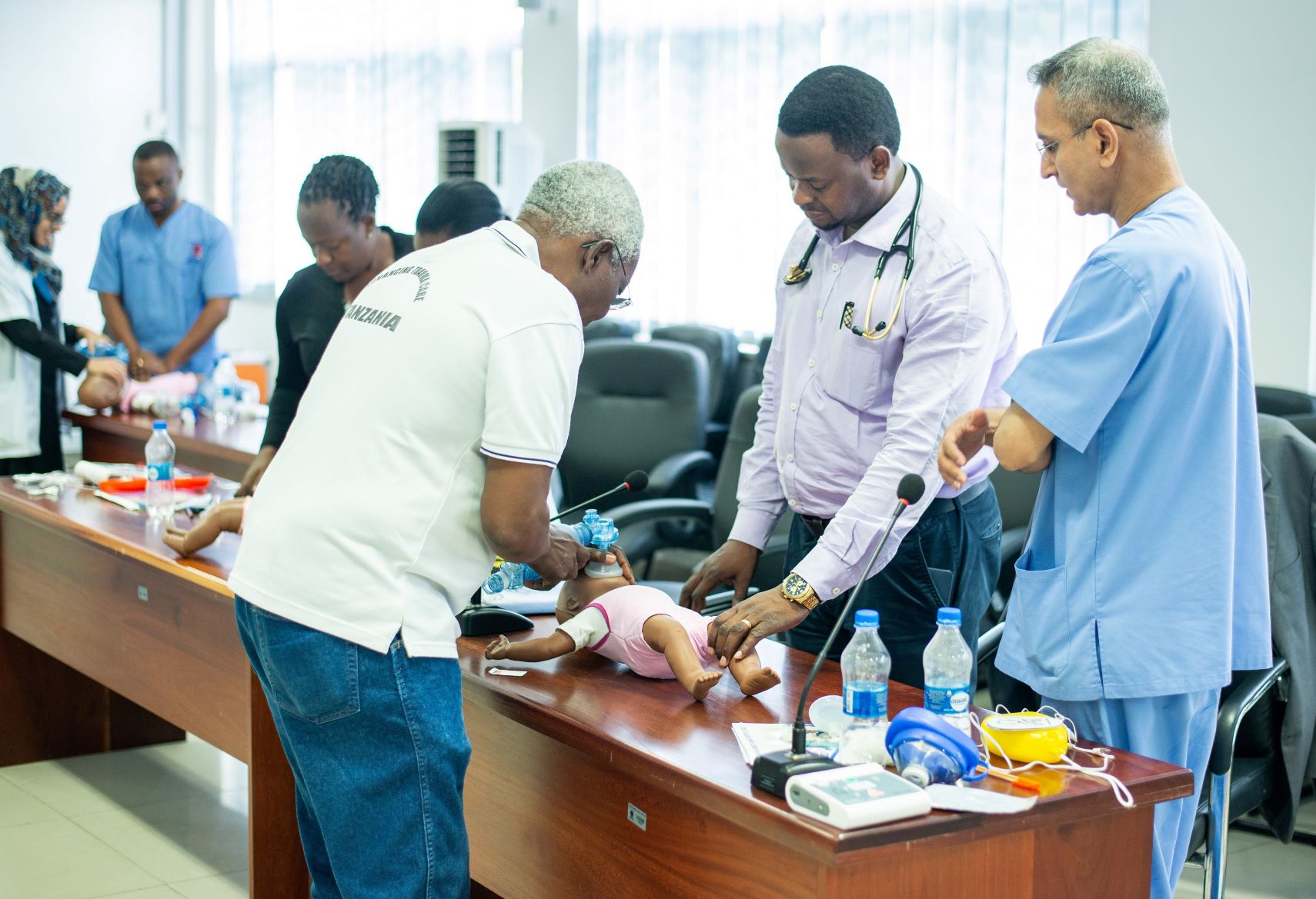 Madaktari na wauguzi wa Taasisi ya Moyo Jakaya Kikwete (JKCI) wakijifunza jinsi ya kuokoa maisha ya mtoto aliyepata tatizo la dharula la kiafya wakati wa mafunzo ya siku tatu yanayofanyika katika ukumbi wa mikutano Taasisi hiyo jijii Dar es Salaam. Mafunzo hayo yanatolewa na wataalamu kutoka kituo cha Emergency Medical Services Academy kilichopo Mikocheni jijini Dar es Salaam.
