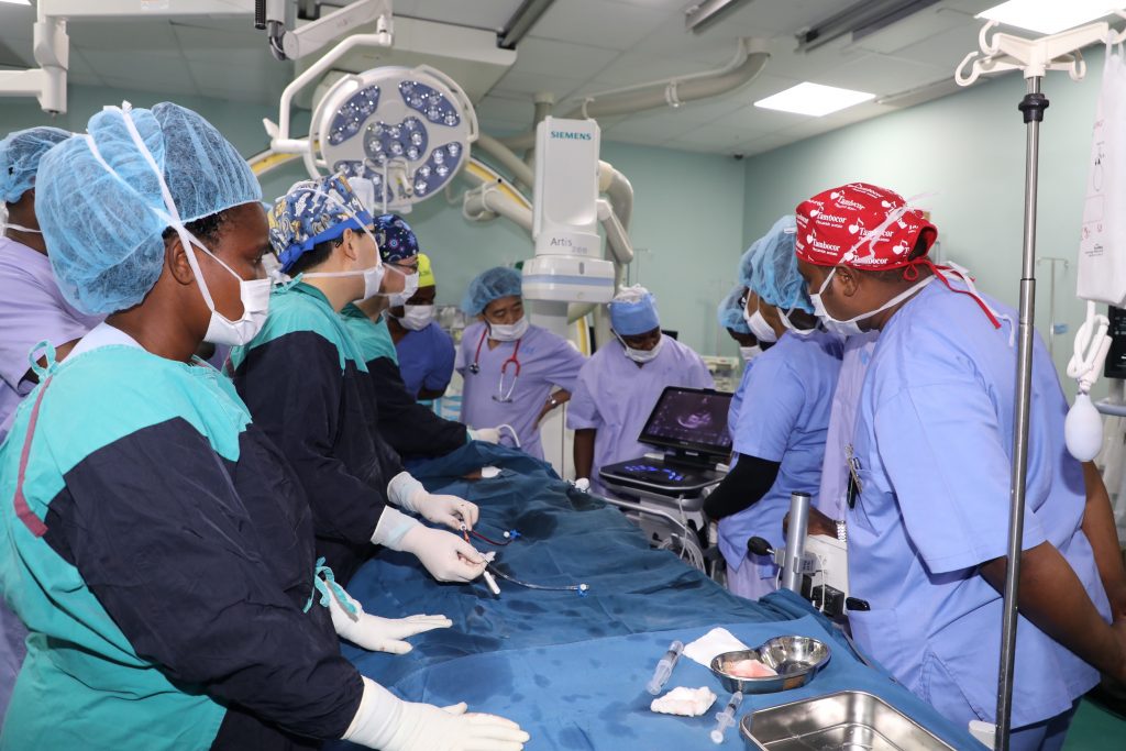 Daktari bingwa wa magonjwa ya moyo kwa watoto wa Taasisi ya Moyo Jakaya Kikwete (JKCI) Naiz Majani na wenzake kutoka Jamhuri ya watu wa China wakimpima mtoto kipimo cha kuangalia jinsi moyo unavyofanya kazi (Echo Cardiogram) kabla ya kumfanyia upasuaji mdogo wa kuziba tundu la moyo kupitia mshipa wa damu wa kwenye paja kwa kutumia mashine ya (ECHO machine) bila ya kutumia mionzi (Transthoracic Echocardiography – TTE). Mara nyingi upasuaji huo hufanyika kwa njia ya mionzi kwa kutumia mtambo wa Cathlab (Catheterization Laboratory).