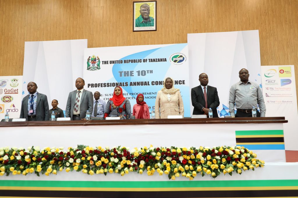 Naibu Waziri wa Fedha na Mipango Mhe. Dkt. Ashatu Kijaji (wa tatu kushoto) akiimba wimbo wa Taifa wakati wa ufunguzi wa Kongamano la Kumi la Wataalam wa Ununuzi na Ugavi (PSPTB) lililofanyika Dododma. Wengine kutoka kushoto Kaimu Mkurugenzi Mtendaji wa PSPTB Bw. Godfrey Mbanyi, Kamishna wa Idara ya Sera ya Ununuzi wa Umma wa Wizara ya Fedha na Mipango Dkt. Frederick Mwakibinga, Mwakilishi wa Mkaguzi na Mdhibiti Mkuu wa Hesabu za Serikali (CAG) Bi. Mwadawa Mgendera, Afisa Mtendaji Mkuu Mamlaka ya Udhibiti wa Ununuzi wa Umma (PPRA) Mhandisi Leonard Kapongo.