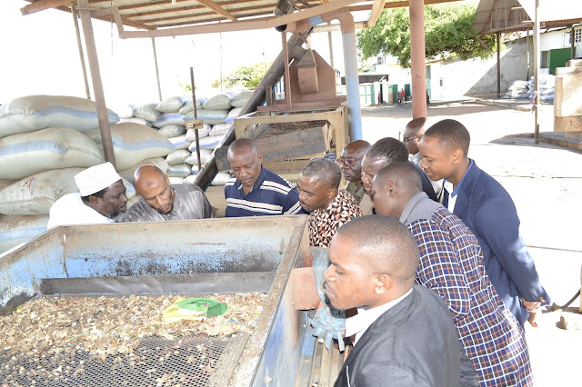 Mkurugenzi wa kiwanda cha Singida Fresh Oil Mill, maarufu Kilimo Kwanza, Khalid Ally Omary akimuonesha Naibu Waziri wa Kilimo Omary Mgumba (katikati) aina ya mbegu mbalimbali za alizeti zinazofaa kwa uzalishaji bora wa mafuta ya kupikia. Kushoto ni Mbunge wa jimbo la Singida Kaskazini, aliyemwakilisha mbunge wa Singida Mjini Mussa Sima.