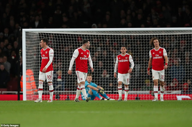 Wachezaji wa Arsenal wakirejea katikati kinyonge baada ya kuruhusu bao wakichapwa 2-1 na Brighton & Hove Albion kwenye mchezo wa Ligi Kuu ya England usiku wa jana Uwanja wa Emirates, London. Mabao ya Brighton yalifungwa na Adam Webster dakika ya 36 na Neal Maupay dakika ya 80, wakati la Arsenal lilifungwa na Alexandre Lacazette dakika ya 50 PICHA ZAIDI SOMA HAPA