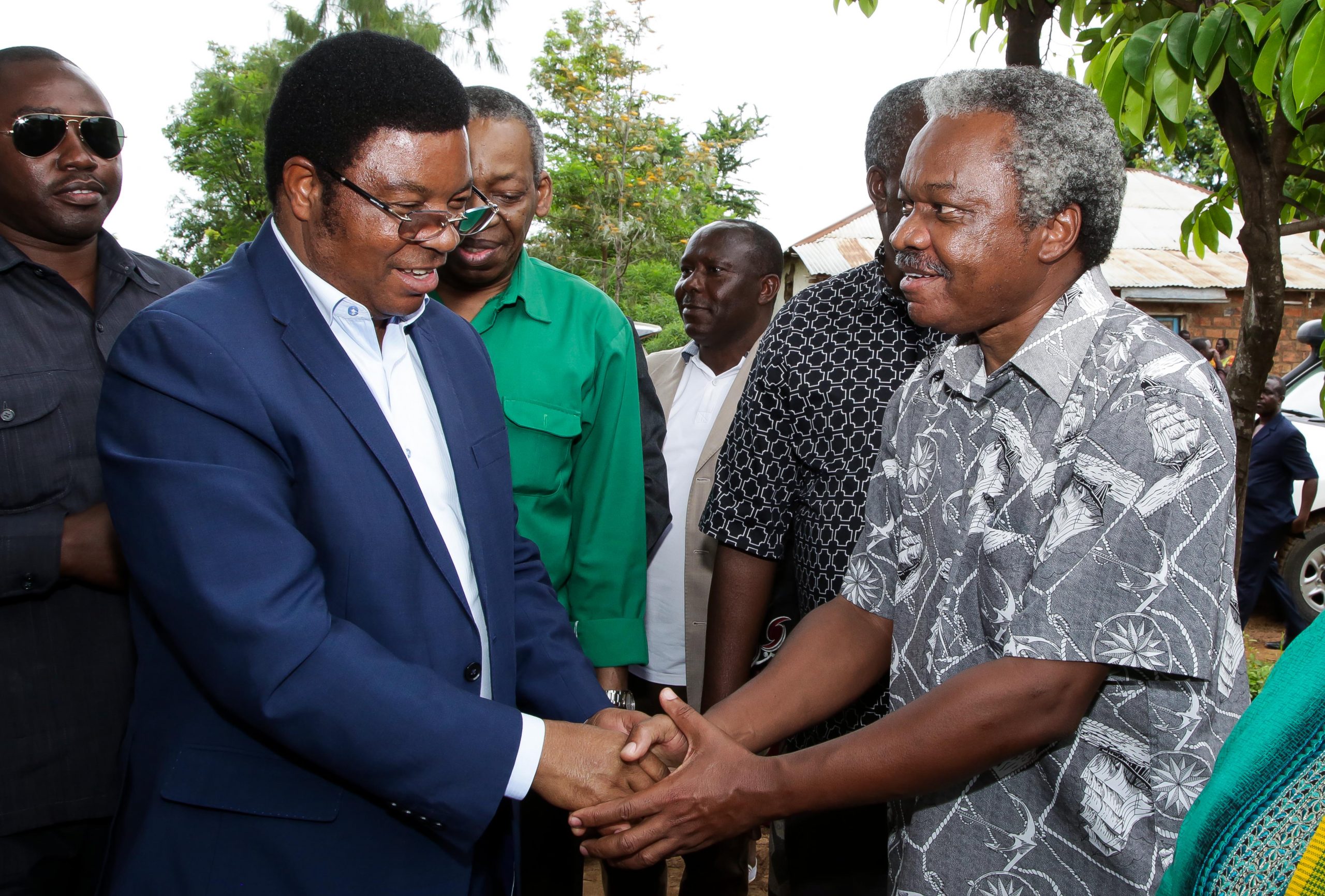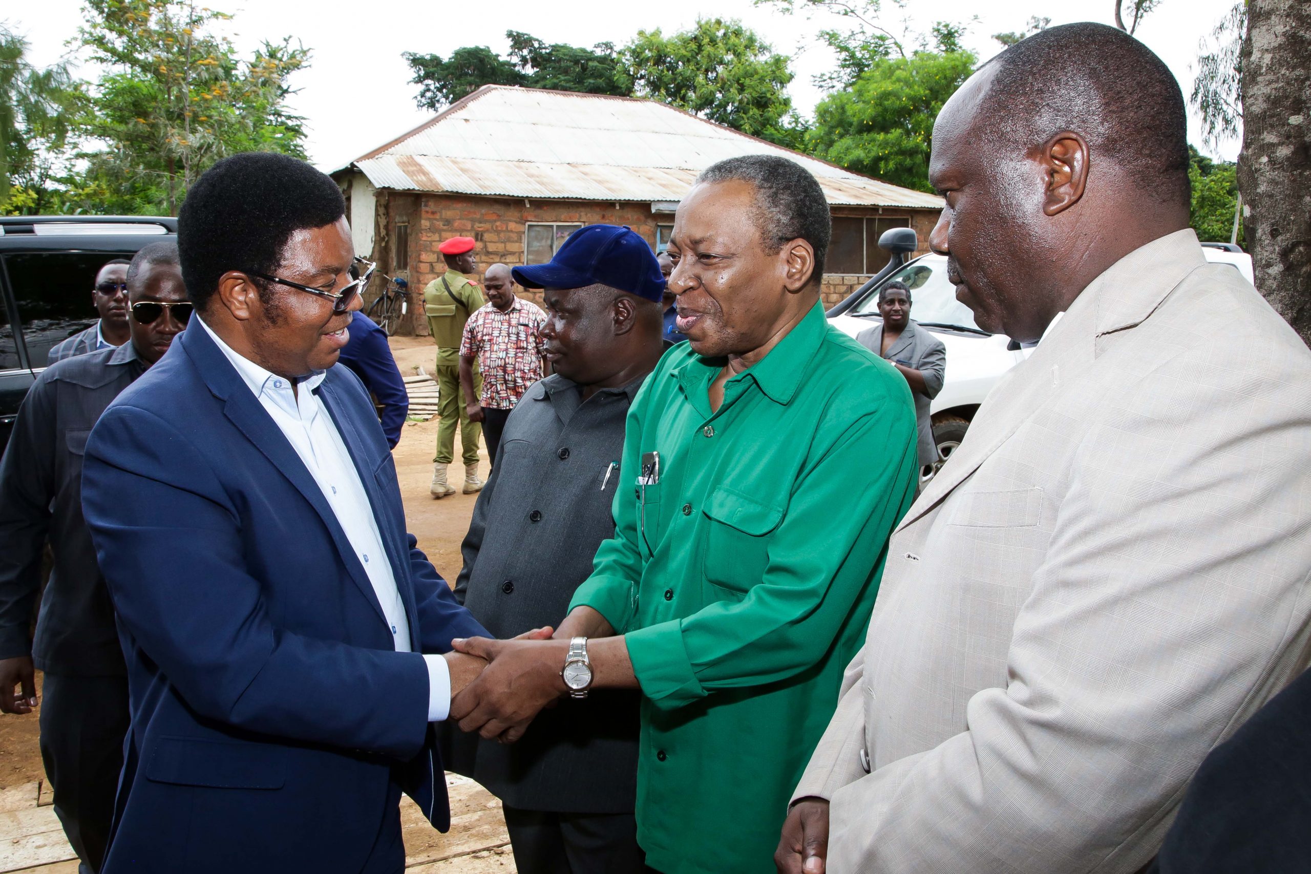 Waziri Mkuu, Kassim Majaliwa, akisalimiana na Mtoto wa Baba wa Taifa, Mdaraka Nyerere, kwenye msiba wa Kaka wa Mama Maria Nyerere, Mzee Inyasi Gabriel, aliyefariki tarehe 4.12.2019, huko Musoma, mkoani Mara, Desemba 7, 2019. (Picha na Ofisi ya Waziri Mkuu)