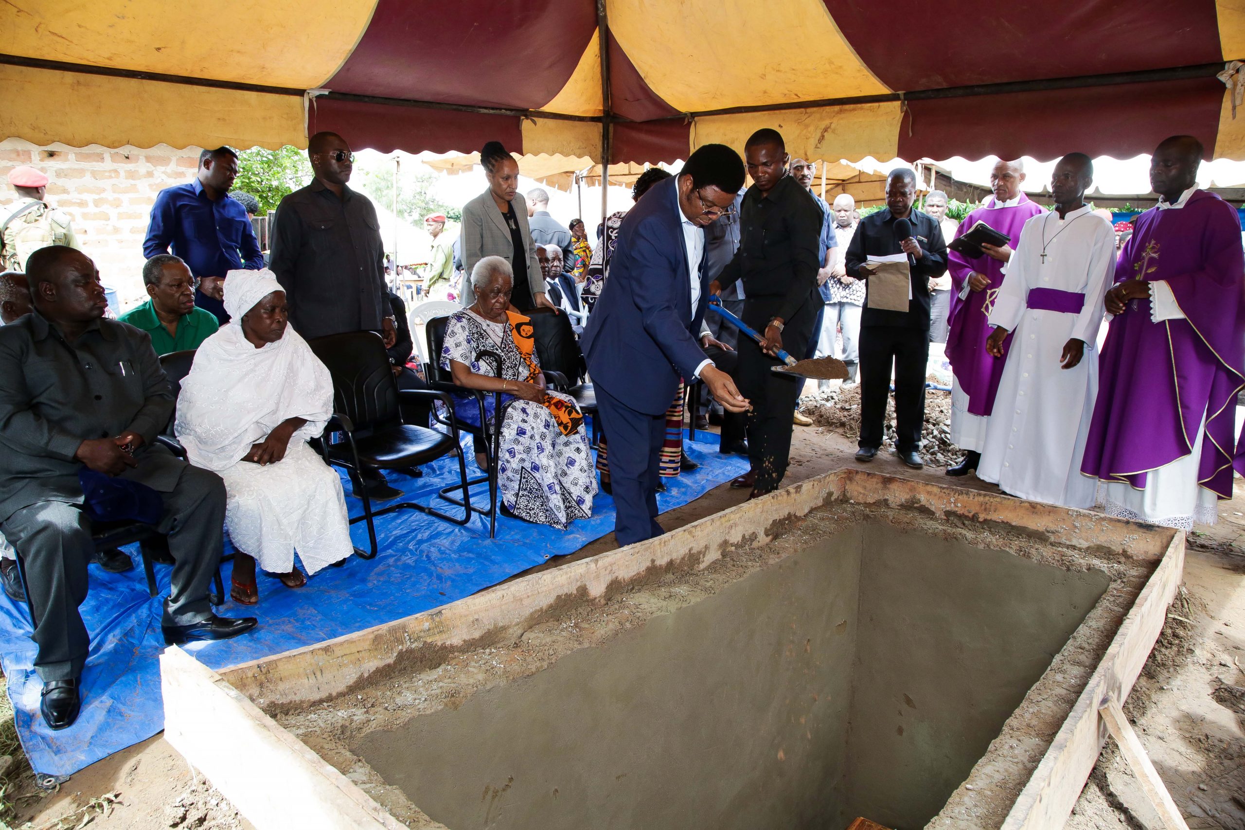 Waziri Mkuu, Kassim Majaliwa, akiweka udongo, kwenye kaburi la Kaka wa Mama Maria Nyerere, Mzee Inyasi Gabriel, aliyefariki tarehe 4.12.2019, huko Musoma, mkoani Mara, Desemba 7, 2019. (Picha na Ofisi ya Waziri Mkuu)