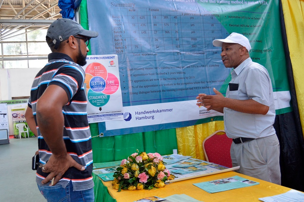 Mratibu Msaidizi wa Mfumo Pacha wa mafunzo(DATS) kutoka VETA, Challange Fihili akimuelezea namna mfumo pacha wa mafunzo(Dual Apprenticeship Training System-DATS) unaoendeshwa kwa pande kuu mbili zinazohusisha viwanda pamoja na Vyuo vya VETA mmoja wa wananchi waliofika kwenye maonesho ya wiki ya Viwanda yanayofanyika katika viwanja vya Sabasaba jijini Dar es Salaam leo.