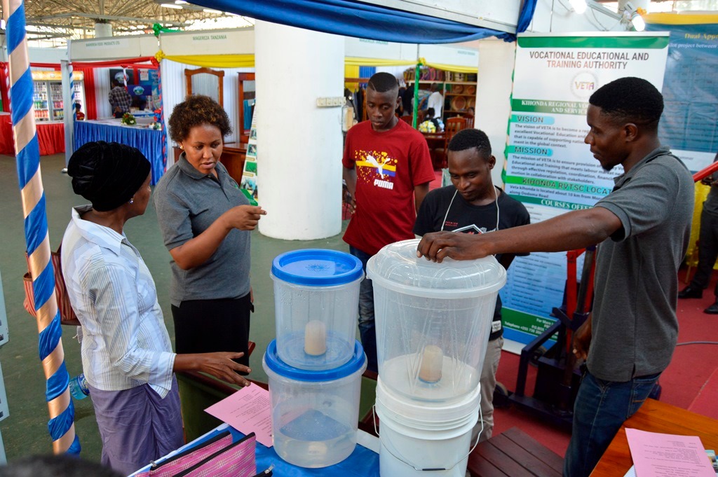 Mhitimu wa VETA, Zadock James akitolea ufafanuzi kuhusu ubunifu wa mfumo wa kuchuja maji safi na salama kwa mmoja wa wananchi waliofika kwenye maonesho ya Viwanda yaliyoanza Desemba 05 hadi Desemba 07, 2019.