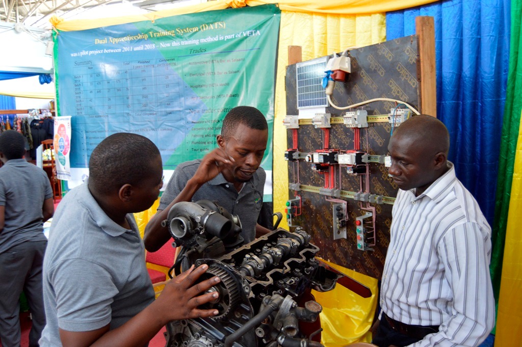 Mwanafunzi wa VETA wa Mwaka wa Tatu wa Kozi ya Automotive Mechanics, Shafii Kamugisha akiwafafanulia wananchi waliofika kwenye maonesho kuhusu mfumo wa Injini unavyofanya kazi kwenye Maonesho ya Nne ya Bidhaa za Viwanda vya Tanzania yaliyoanza tarehe 5 hadi 9 Desemba, 2019 katika Uwanja wa Maonesho wa Mwalimu J.K.Nyerere jijini Dar es Salaam.