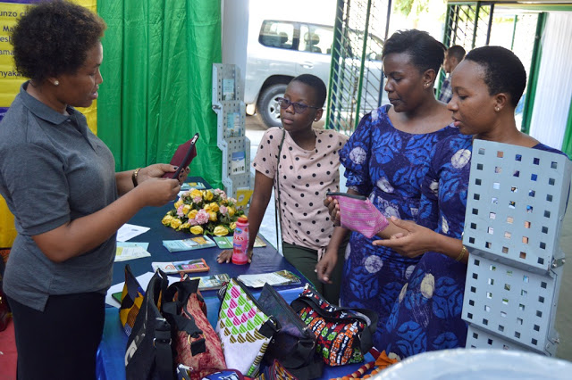 Afisa Uhusiano wa VETA Dora Tesha akitolea ufafanuzi kuhusu utengenezwaji wa pochi kwa wananchi waliofika katika Maonesho ya Nne ya Bidhaa za Viwanda vya Tanzania yaliyoanza tarehe 5 hadi 9 Desemba, 2019 katika Uwanja wa Maonesho wa Mwalimu J.K.Nyerere
