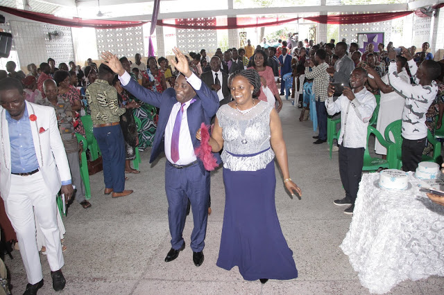 Mgeni rasmi katika maadhimisho ya miaka 25 ya Huduma ya Kanisa la Abundant Blessing Centre (ABC), Baba Askofu mstaafu wa Kanisa la Tanzania Evangelist Assemblies of God ( EAGT) Dkt. Asumwisye Mwaisabila (kushoto),akiongoza kumuombea Askofu wa Kanisa hilo, Flaston Ndabila na mke wake Janeth katika maadhimisho hayo yaliyofanyika jana.