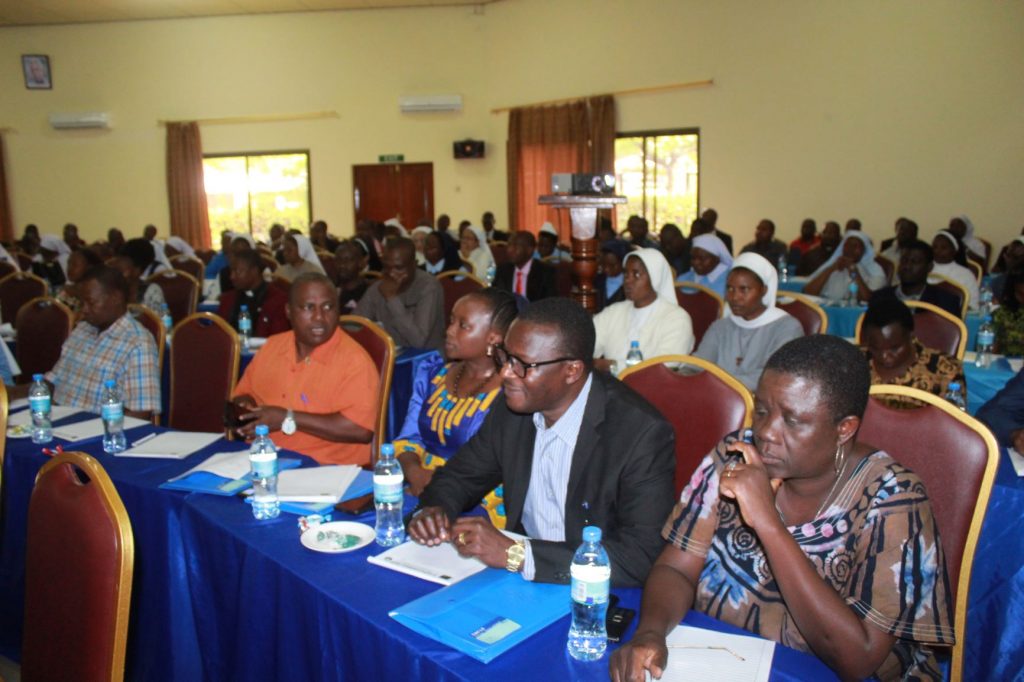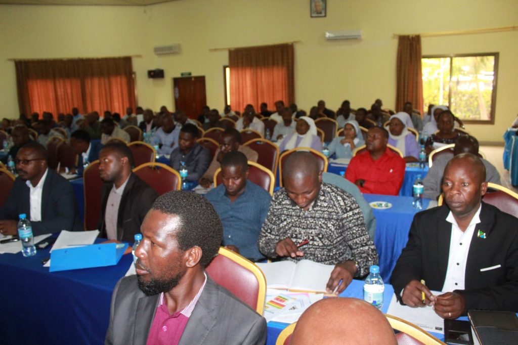 Sehemu ya washiriki wakifatilia Hotuba ya Mgeni rasmi wakati wa ufunguzi wa Mkutano wa wakuu wa shule za sekondari za Makanisa yaliyo chini ya Kanisa Katoliki na Jumuiya ya Kikristo Tanzania ambayo yanaratibiwa na Tume ya Kikristo ya Huduma za Jamii [CSSC]