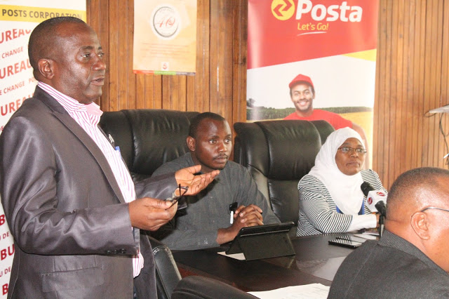 Mkuu wa Kitengo cha Mawasiliano wa Shirika la Posta Tanzania (TPC), Elia Madulesi, akifafanua jambo kwa waandishi wa habari katika mkutano huo.