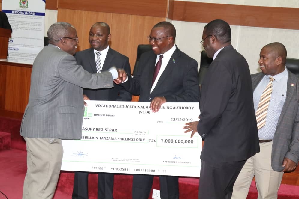 Waziri wa Fedha na Mipango Dkt. Philip Mpango akipokea mfano wa hundi ya Shilingi bilioni moja kutoka kwa Mwenyekiti wa Bodi ya Taifa ya Elimu na Mafunzo ya Ufundi Stadi Ndg. Peter Maduki (kushoto) ikiwa ni gawio la VETA kwa Serikali katika hafla iliyofanyika jijini Dodoma leo tarehe 12 Desemba 2019. Kulia ni Mkurugenzi Mkuu wa VETA Dkt. Pancras Bujulu. Wengine katika picha ni Msajili Hazina, Athumani Mbuttuka na Naibu Katibu Mkuu, Adolf Ndunguru.