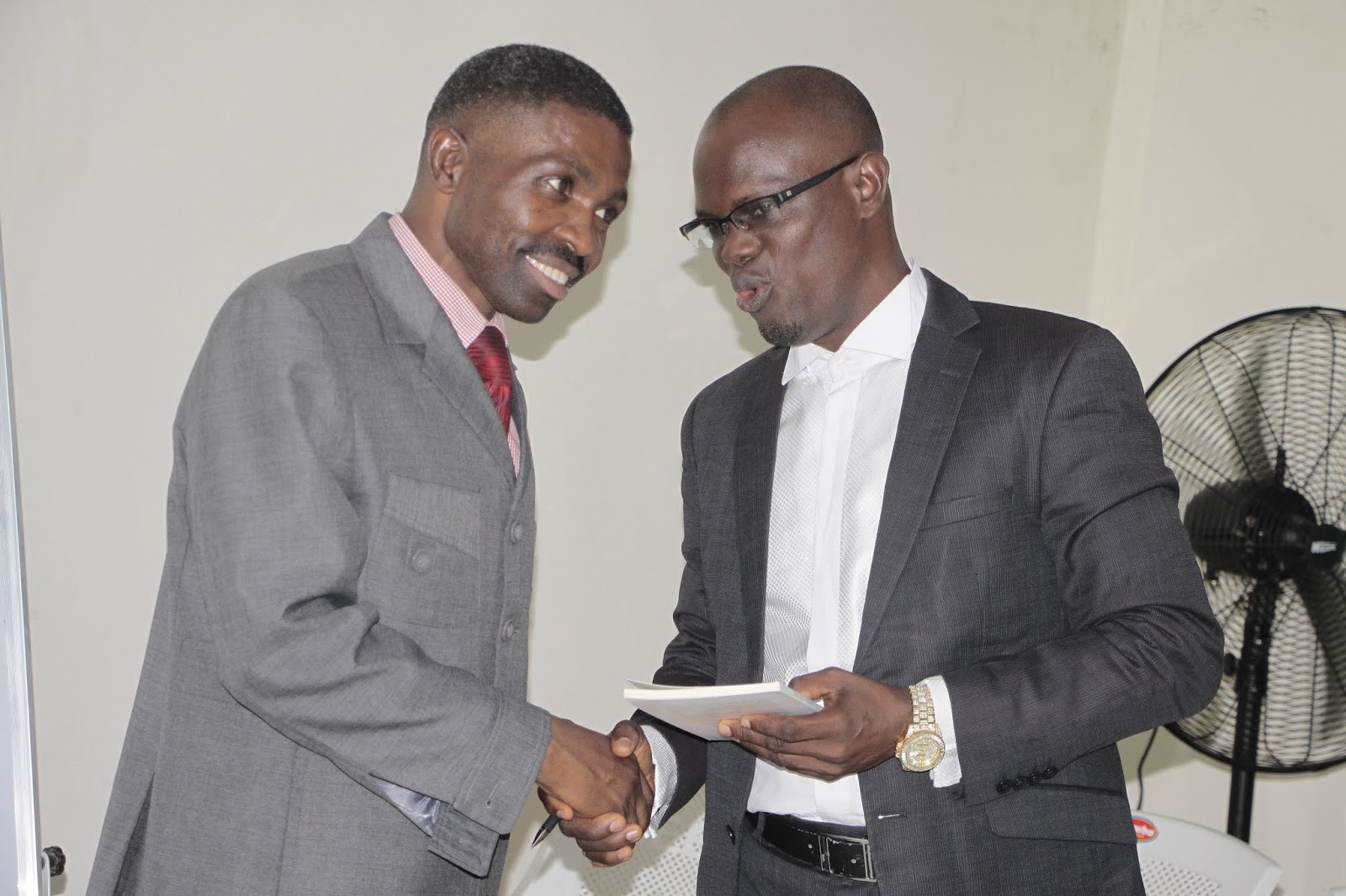 Mtume Paul Toritseju (kushoto) kutoka Nigeria, akimkabidhi kitabu, Mwezeshaji katika semina hiyo, Mchungaji Dkt. Robert Mbelwa.