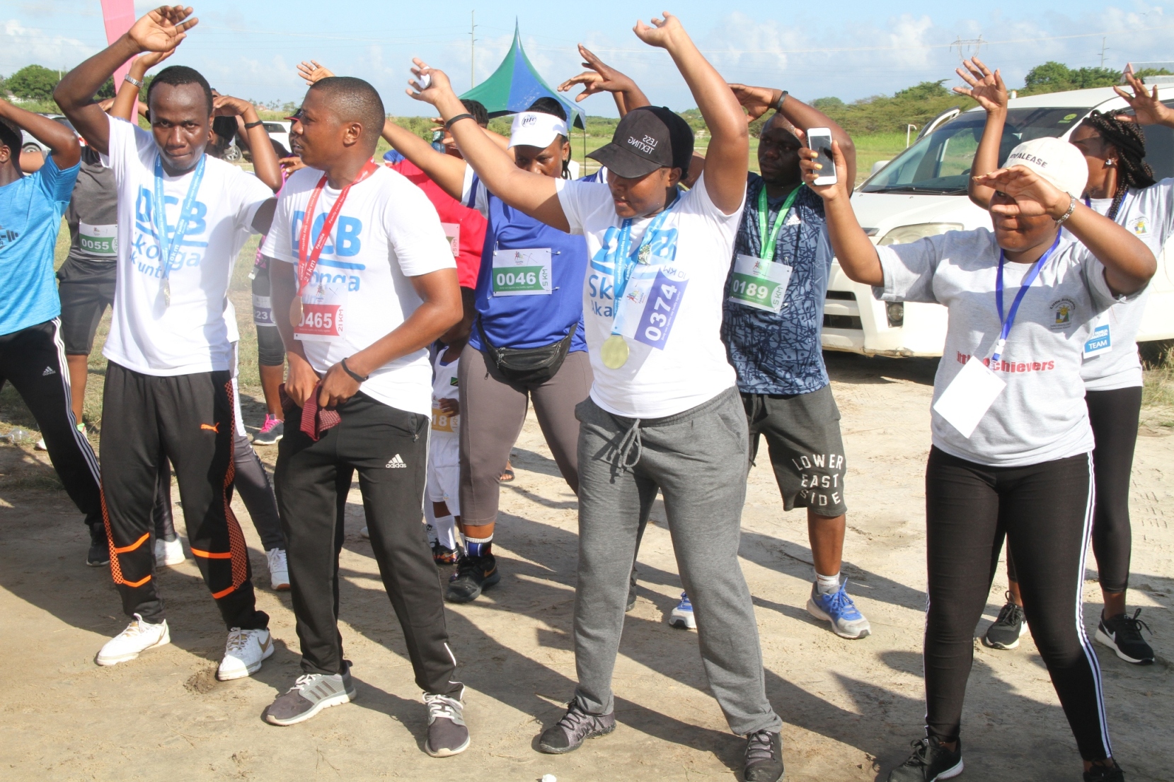 Baadhi ya wafanyakazi wa Benki ya Biashara ya DCB, pamoja na wakimbiaji wengine wakipasha viungo wakati wa mashindano ya Familia Marathon yaliyofanyika katika viwanja vya Chumvi, Bahari Beach jijini Dar es Salaam hivi karibuni. DCB ilidhamini tukio hilo.