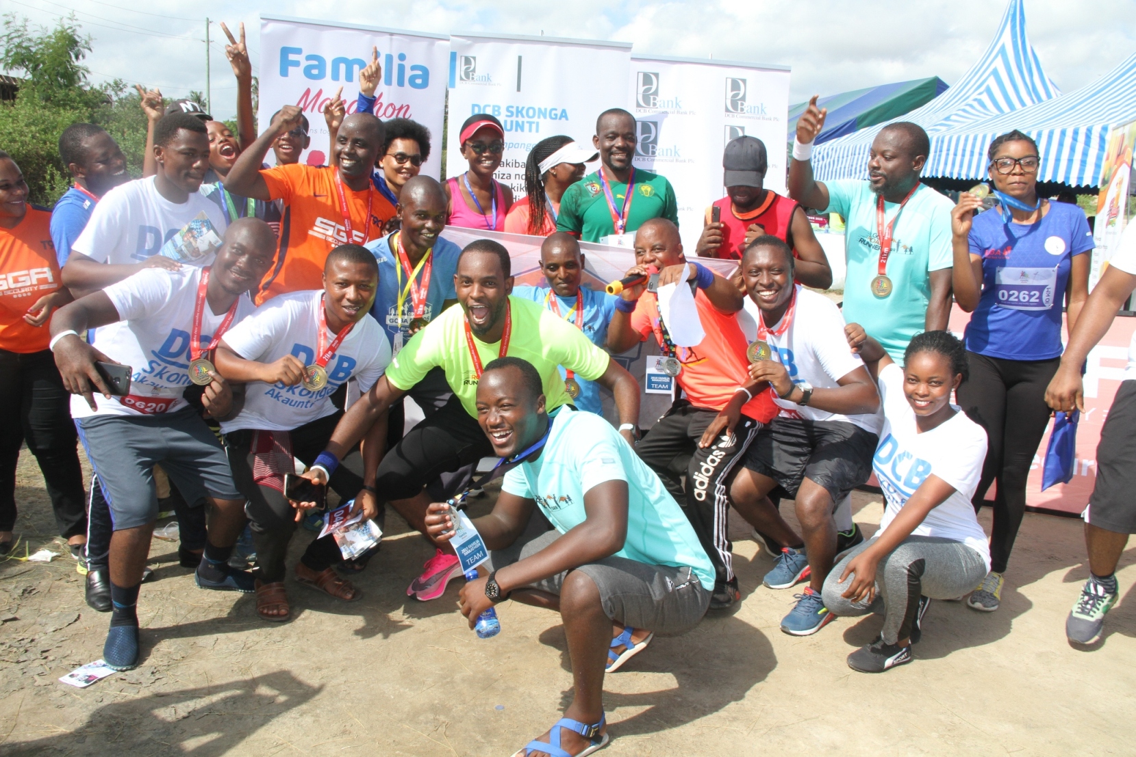 Baadhi ya wafanyakazi wa Benki ya Biashara ya DCB walioshiriki mbio za Familia Marathon pamoja na wakimbiaji wengine wakishangilia mara baada ya kumalizika kwa tukio hilo katika viwanja vya Chumvi, Bahari Beach, Dar es Salaam hivi karibuni. Tukio hilo lilidhaminiwa na DCB.