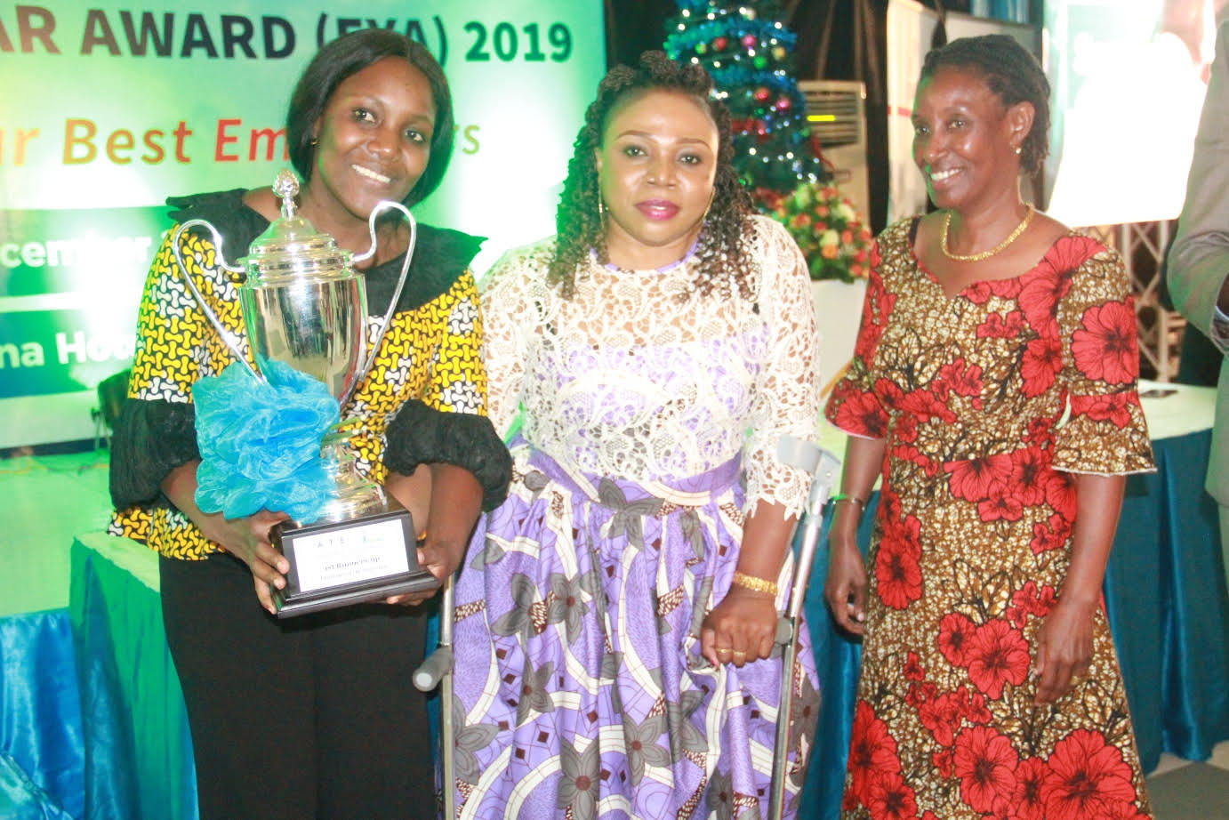Naibu Waziri Ofisi ya Waziri Mkuu Sera,Bunge,Kazi,Vijana, na wenye Ulemavu Mh. Stella Ikupa (katikati), akitoa tuzo kwa mwajiri bora wa mwaka 2019 kwa nafasi ya mshindi wa pili Elizabeth Karua wakati wa hafla yaTuzo ya mwaajiri bora wa mwaka 2019 iliyoandaliwa na Chama cha Waajiri Tanzania (ATE) katika Hotel ya Serena jijini Dar es Salaam jana hafla hiyo iliyoudhuriwa na wadau mbalimbali wakiwemo Naibu Waziri wa Stella Ikupa (MP) pamoja na Taasisi mbalimbali. anaeshuhudia (kulia), ni Mwenyekiti wa Bodi wa Chama Cha Waajiri Tanzania (ATE), Jayne Nyimbo.
