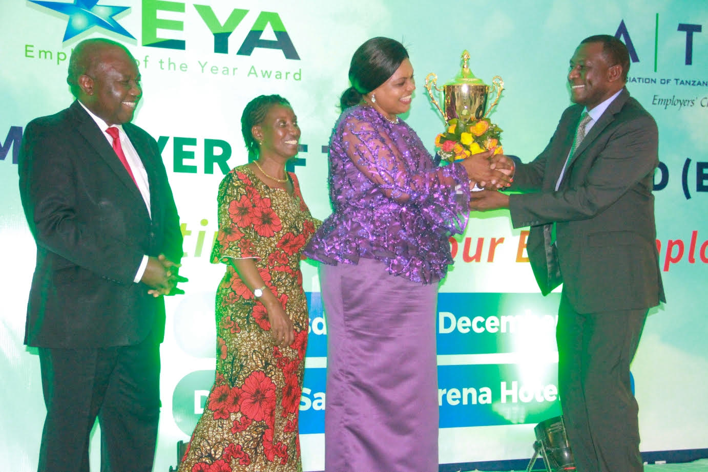 Naibu Waziri Ofisi ya Waziri Mkuu Sera,Bunge,Kazi,Vijana, na wenye Ulemavu Mh. Stella Ikupa (katikati), akitoa tuzo kwa mwajiri bora wa mwaka 2019 kwa nafasi ya mshindi wa pili Elizabeth Karua wakati wa hafla yaTuzo ya mwaajiri bora wa mwaka 2019 iliyoandaliwa na Chama cha Waajiri Tanzania (ATE) katika Hotel ya Serena jijini Dar es Salaam jana hafla hiyo iliyoudhuriwa na wadau mbalimbali wakiwemo Naibu Waziri wa Stella Ikupa (MP) pamoja na Taasisi mbalimbali. anaeshuhudia (kulia), ni Mwenyekiti wa Bodi wa Chama Cha Waajiri Tanzania (ATE), Jayne Nyimbo.