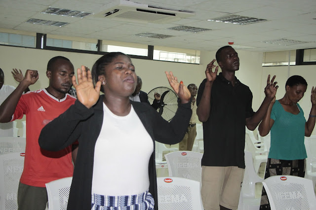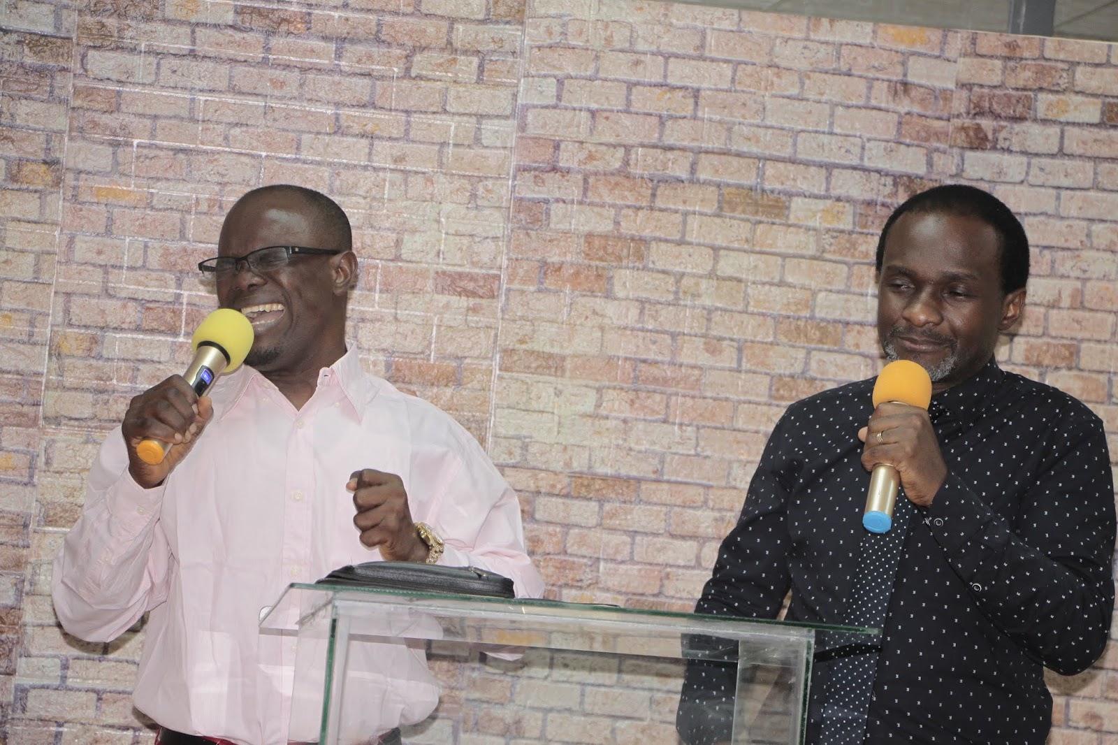 Mtume Paul Toritseju kutoka Nigeria (kushoto) Mchungaji Dkt. Sako Mayrick wakiongoza maombi katika semina ya uponyaji inayoendelea leo Success Chapel Jengo la Ushirika Mnazi Mmoja jijini Dar es Salaam.