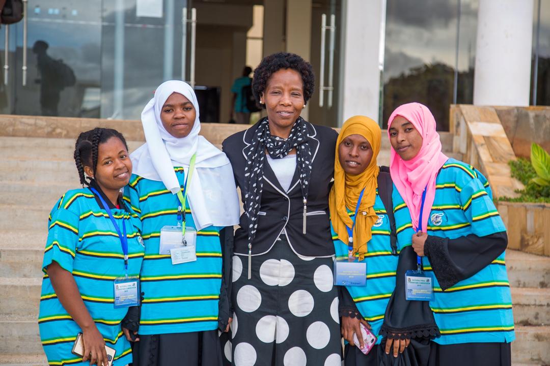Mkurugenzi wa Tehama wa TCRA Connie Francis akiwa na washiliki wasichana wa Shindano la Usalama wa mitandao Vyuo vikuu.