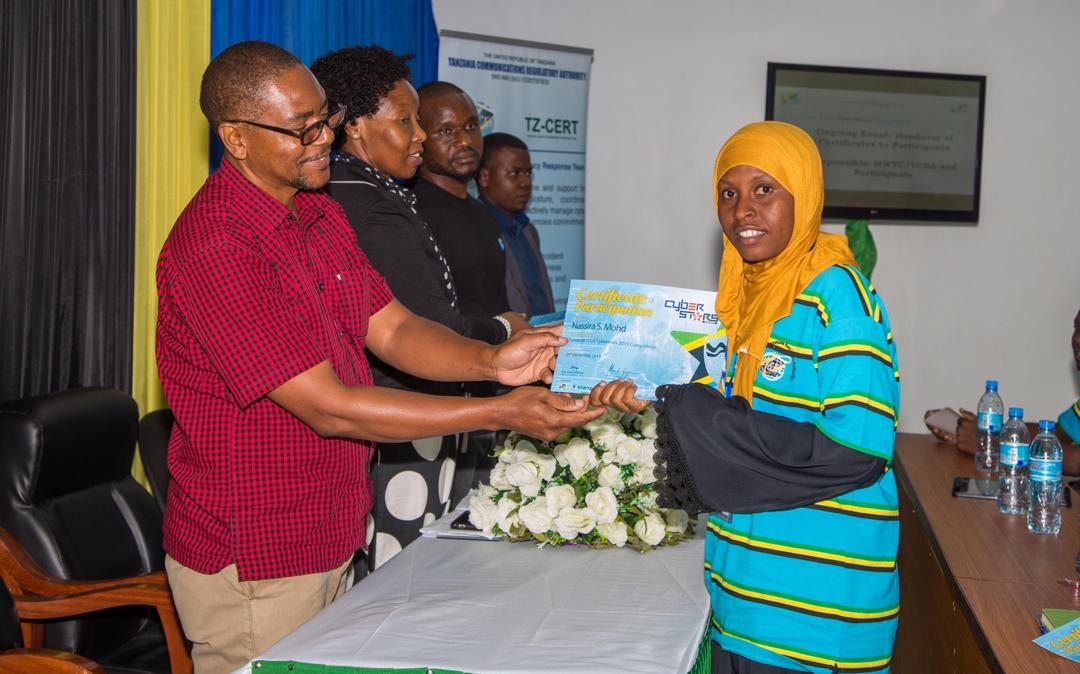 Mgeni Rasmi wa Mafunzo ya Usalama wa Mitandao wa Wizara ya Ujenzi,Uchukuzi na Mawasiliano Mhandisi Richard Mgema akimkabidhi cheti cha mafunzo katika Shindano la Usalama wa Mitandao Nasra Mohamed lililoandaliwa na TCRA .