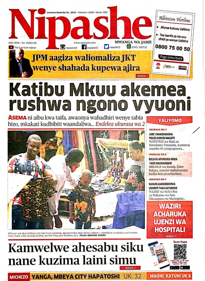 MagazetiPITIA VICHWA VYA HABARI KATIKA MAGAZETI YA LEO DISEMBA 24,2019 Last updated: 2019/12/24 at 3:11 AM Alex Sonna 6 years ago Share SHARE Alex Sonna December 24, 2019 December 24, 2019 Share this Article Facebook Twitter Email Print Previous Article WAZIRI KALEMANI AAGIZA KUWEKWA NDANI WAKANDARASI WA UMEME VIJIJI KIGOMA Next Article UYUI KULIMA HEKTA 5,000 ZA PAMBA MSIMU HUU