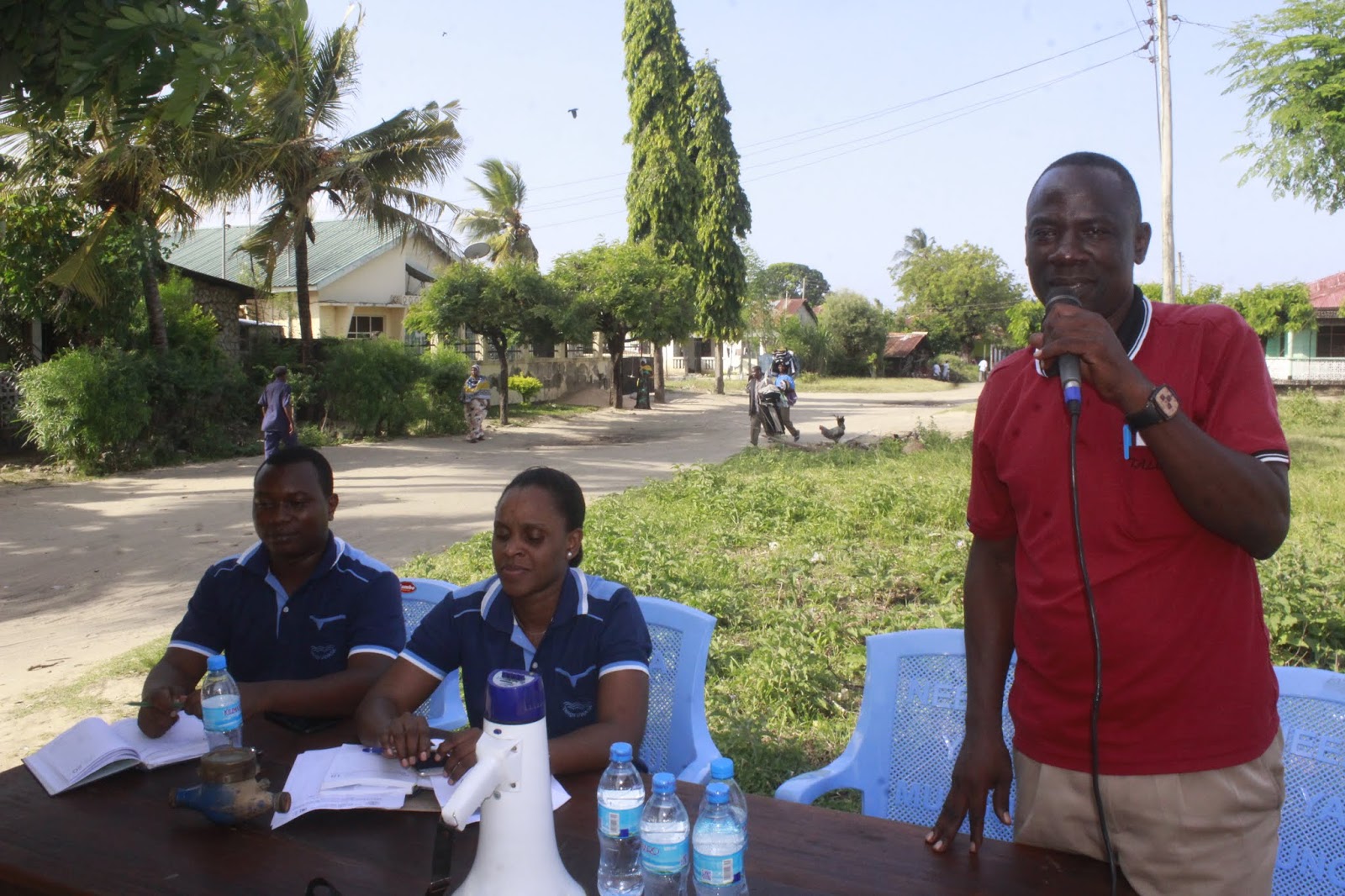 | Msimamizi wa Mtandao wa Maji Tanga Uwasa George Mbalai akigawa vipeperushi kwa wananchi wakati wa mkutano huo |