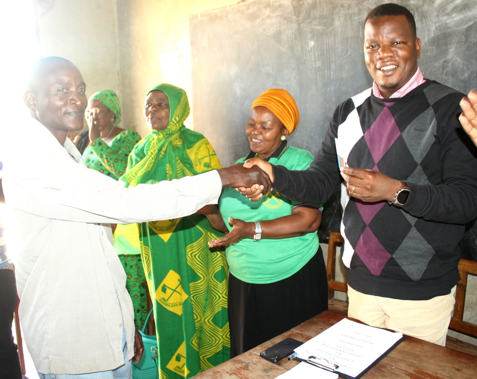 Mbunge wa Jimbo la Shinyanga mjini Stephen Masele akimkaribisha CCM Bulugu Mboje ambaye alikuwa akigombea nafasi ya uenyekiti wa kijiji Galamba kupitia CHADEMA.