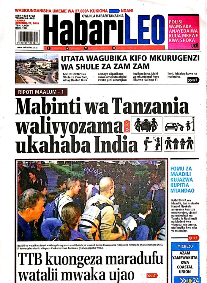 MagazetiPITIA VICHWA VYA HABARI KATIKA MAGAZETI YA LEO DISEMBA 27,2019 Last updated: 2019/12/27 at 3:33 AM Alex Sonna 6 years ago Share SHARE Alex Sonna December 27, 2019 December 27, 2019 Share this Article Facebook Twitter Email Print Previous Article MECHI YA YANGA NA TANZANIA PRISONS YAHAMISHIWA UWANJA WA SAMORA MJINI IRINGA KESHO Next Article ARSENAL YABANWA MBAVU NA AFC BOURNEMOUTH EPL