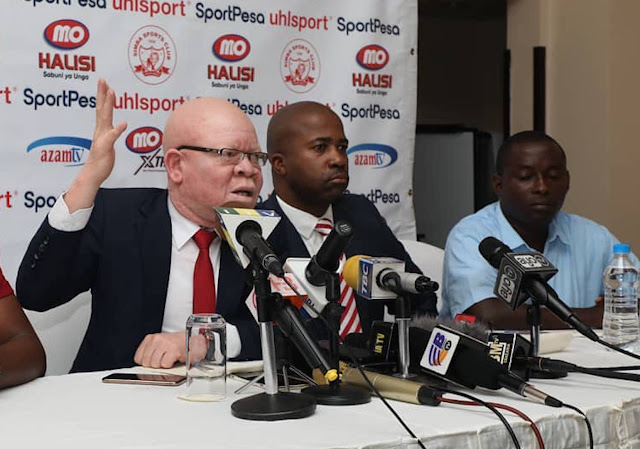 Afisa Habari wa klabu ya Simba, Haji Sunday Manara akitaja viingilio vya mchezo wa Ligi Kuu ya Tanzania Bara dhidi ya mahasimu wao wa jadi, Yanga SC Jumamosi Uwanja wa Taifa Jijini. Wengine kulia ni Mtendaji Mkuu wa klabu, Senzo Mbatha na Mkurugenzi wa Wanachama na Mashabiki, Hashim Mbaga na viingilio ni Sh. 30,000 VIP, Sh. 20,000 VIP B na C na Sh. 7000 kwa mzunguko