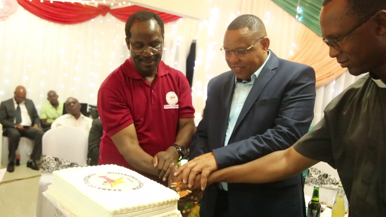 Viongozi mbalimbali wakishiriki kukata keki kuashiria maadhimisho ya kimafanikio ya miaka 5 ya SPRF na Jamii. Kulia ni Padri Gilbert Mwilu, Mbunge wa Singida Mashariki Miraji Mtaturu na Mkurugenzi wa taasisi hiyo Dkt .Suleiman Muttani.