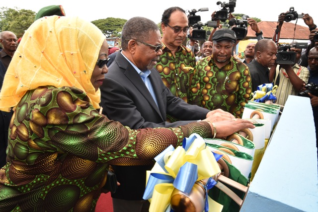 RAIS wa Zanzibar na Mwenyekiti wa Baraza la Mapinduzi Mhe.Dk. Ali Mohamed Shein akikata utepe kuashiria ufunguzi wa Mradi wa Maji Safi na Usafi wa Mazingira Saateni Wilaya ya Mjini Unguja, (kulia kwa Rais) Waziri wa Ardhi Nyumba Maji na Nishati.Mhe. Salama Aboud Talib na (kushoto kwa Rais) Katibu Mkuu Wizara ya Ardhi Nyumba Maji na Nishati.Ndg.Ali Halil na Mkurugenzi Mkuu wa (ZAWA)Ndg. Mussa Ramadhani Haji, ikiwa ni shamrashamra za kuadhimisha Miaka 56 ya Mapinduzi ya Zanzibar.(Picha na Ikulu)