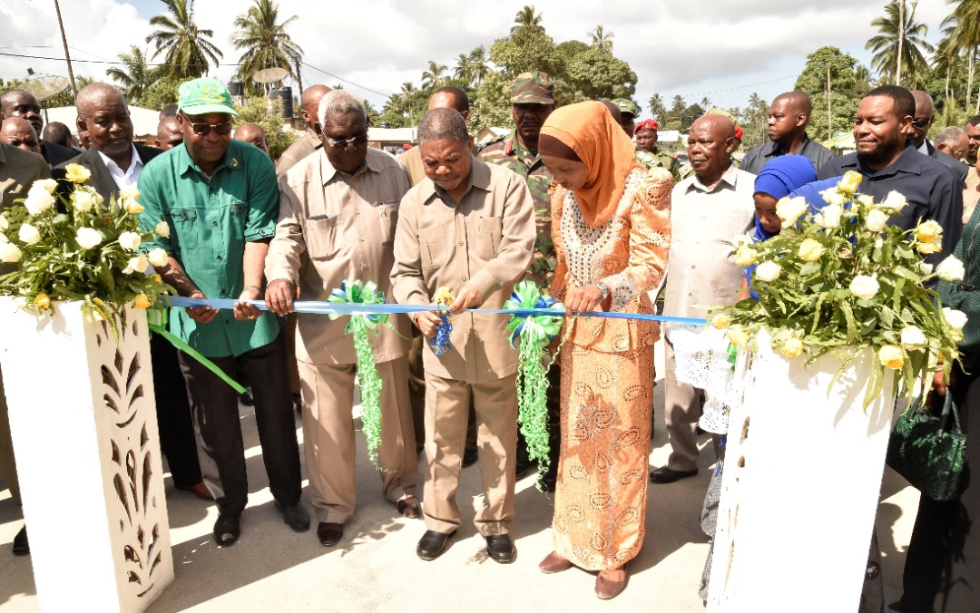 RAIS wa Zanzibar na Mwenyekiti wa Baraza la Mapinduzi Mhe.Dk.Ali Mohamed Shein, akiondoa kipazia kuashiria ufunguzi wa Daraja la Kibondemzungu Fuoni Wilaya ya Magharibi “B” Unguja (kulia kwa Rais) Makamu wa Pili wa Rais wa Zanzibar.Mhe. Balozi Seif Ali Iddi na Katibu Mkuu Wizara ya Ujenzi Mawasiliano na Usafirishaji Ndg. Mustafa Aboud Jumbe na (kushoto kwa Rais) Waziri wa Ujenzi Mawasiliano na Usafirishaji Zanzibar Mhe Dkt. Sira Ubwa,ikiwa ni shamrashamra za kusherehekea Miaka 56 ya Mapoinduzi ya Zanzibar.(Picha na Ikulu)