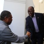 RAIS wa Zanzibar na Mwenyekiti wa Baraza la Mapinduzi Mhe.Dk. Ali Mohamed Shein, akisalimiana na Makamu wa Pili wa Rais wa Zanzibar Mhe.Balozi Seif Ali Iddi, alipowasili katika viwanja vya hafla ya Ufunguzi wa Daraja la Kibondemzungu, ikiwa ni shamrashamra za Miaka 56 ya Mapinduzi ya Zanzibar wakati wa hafla hiyo iliofanyika katika eneo la daraja hilo.(Picha na Ikulu)