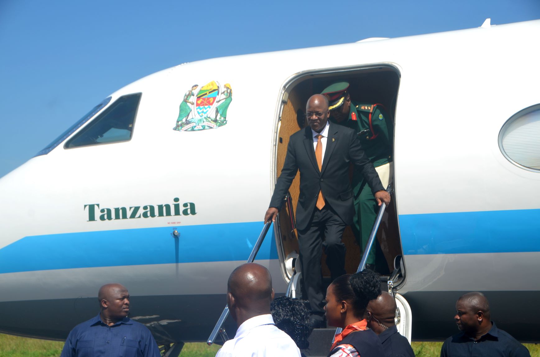 Rais wa Jamhuri ya Muungano wa Tanzania Dkt,John Pombe Magufuli akiteremka katika Uwanja wa Ndege wa Kimataifa wa Aman Abeid Karume tayari kwa ajili ya kuanza ziara yake ya siku mbili pia kuhudhuria Sherehe za miaka 56 ya Mapinduzi ya Zanzibar.
