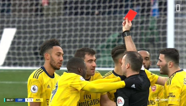Wachezaji wa Arsenal wakimzonga refa Paul Tierney wakati anamuonyesha kadi nyekundu Nahodha wao, Pierre-Emerick Aubameyang dakika ya 67 kwa kumchezea rafu Max Meyer katika sare ya 1-1 na Crystal Palace kwenye mchezo wa Ligi Kuu ya England leo Uwanja wa Selhurst Park Jijini London. Aubameyang alitoka akiwa ameifungia Arsenal bao la kuongoza dakika ya 12 akimalizia pasi ya Alexandre Lacazette, kabla ya Jordan Ayew kuisawazishia Crystal Palace akimtungua Bernd Leno kwa shuti lililombabatiza David Luiz PICHA ZAIDI SOMA HAPA