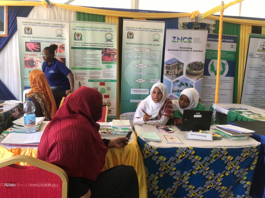 Naibu Waziri wa Wizara ya Afya Zanzibar, Mhe. Harusi Said Suleiman, alipotembelea banda la TAEC alijulishwa juu ya takwa la kisheria la kupima mionzi kwenye mnyororo wa bidhaa kama ilivyoahinishwa kwenye Sheria Na. 7 ya Mwaka 2003, kuwa Sheria hii inaendana na matakwa ya kimataifa ikiwemo shirika la afya duniani (WHO), shirika la kilimo na chakula duniani (FAO), na shirika na nguvu za atomu duniani (IAEA) katika kuhakikisha mionzi kwenye mnyororo wa bidhaa inadhibitiwa ili kuzuia madhara ya mionzi yanayoweza kujitokeza.