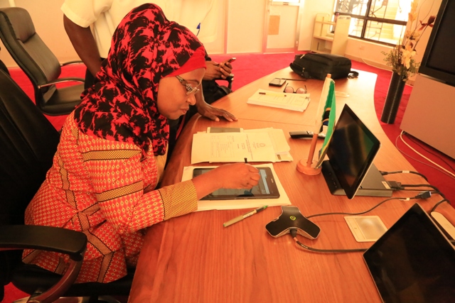 Naibu Waziri wa Nishati, Subira Mgalu,akitia saini kwa kutumia kifaa maalum,ikiwa ni kuridhia Makubaliano ya Sekta ya Nishati yaliyokubaliwa katika Mkutano wa Baraza na Mawaziri wa Afrika Mashariki.
