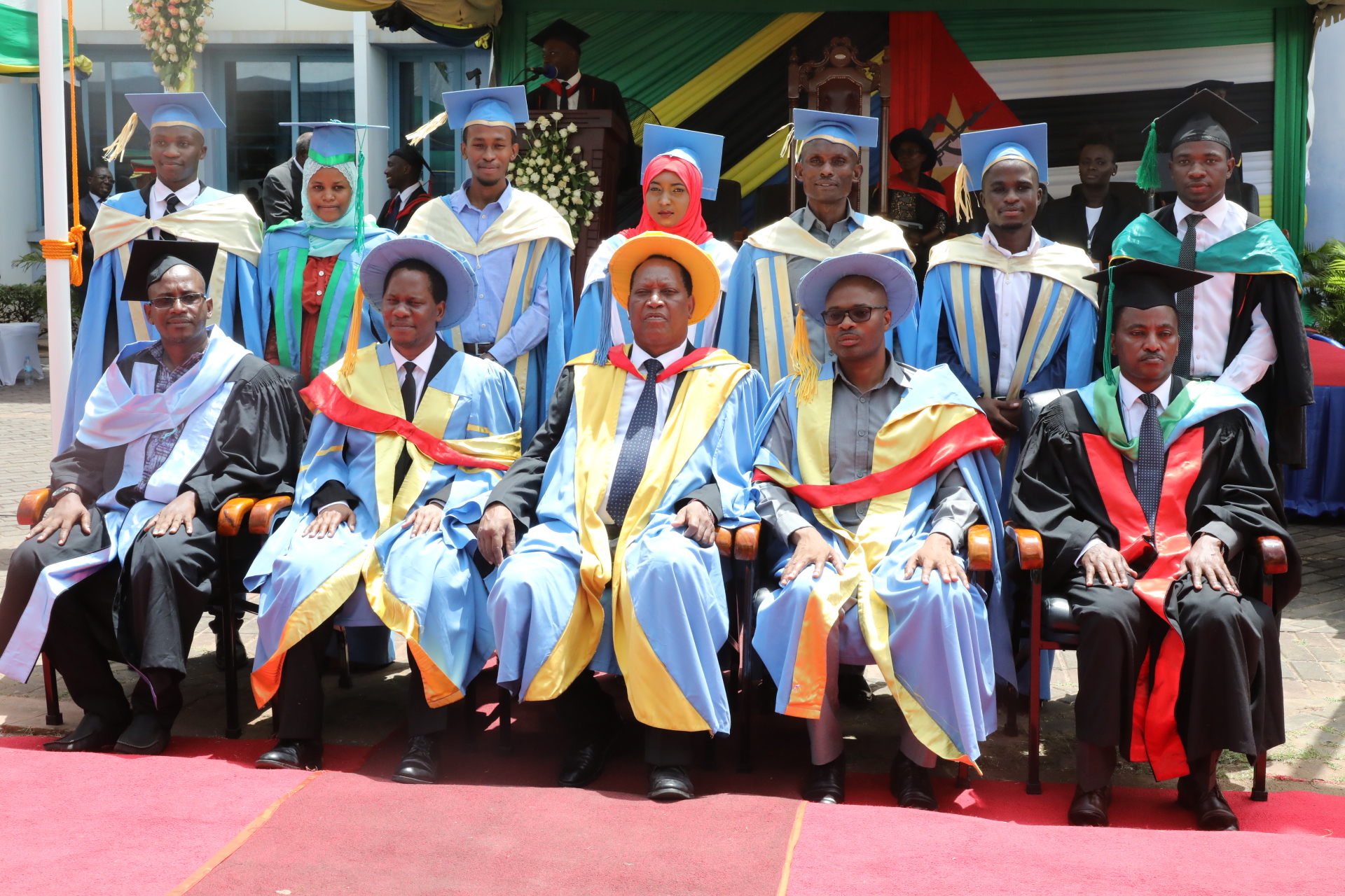 Waziri wa Mambo ya Nje na Ushirikiano wa Afrika Mashariki, Prof. Palamagamba John Kabudi (Mb), Katibu Mkuu wa Wizara ya Mambo ya Nje na Ushikiano wa Afrika MasharikiDkt. Faraji Mnyepe na Kaimu Mkurugenzi wa Chuo, Dkt. Jeremia Ponera wakiwa katika picha ya pamoja na wanafunzi walifaulu vizuri masomo yao.