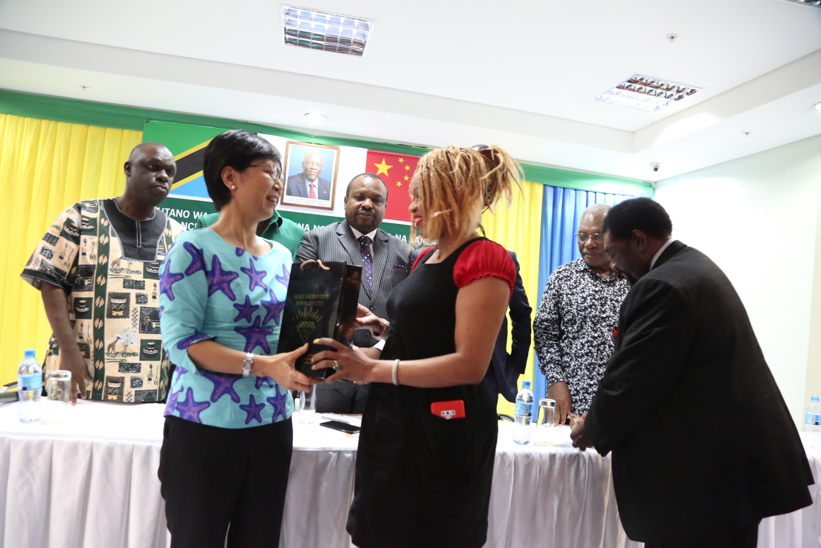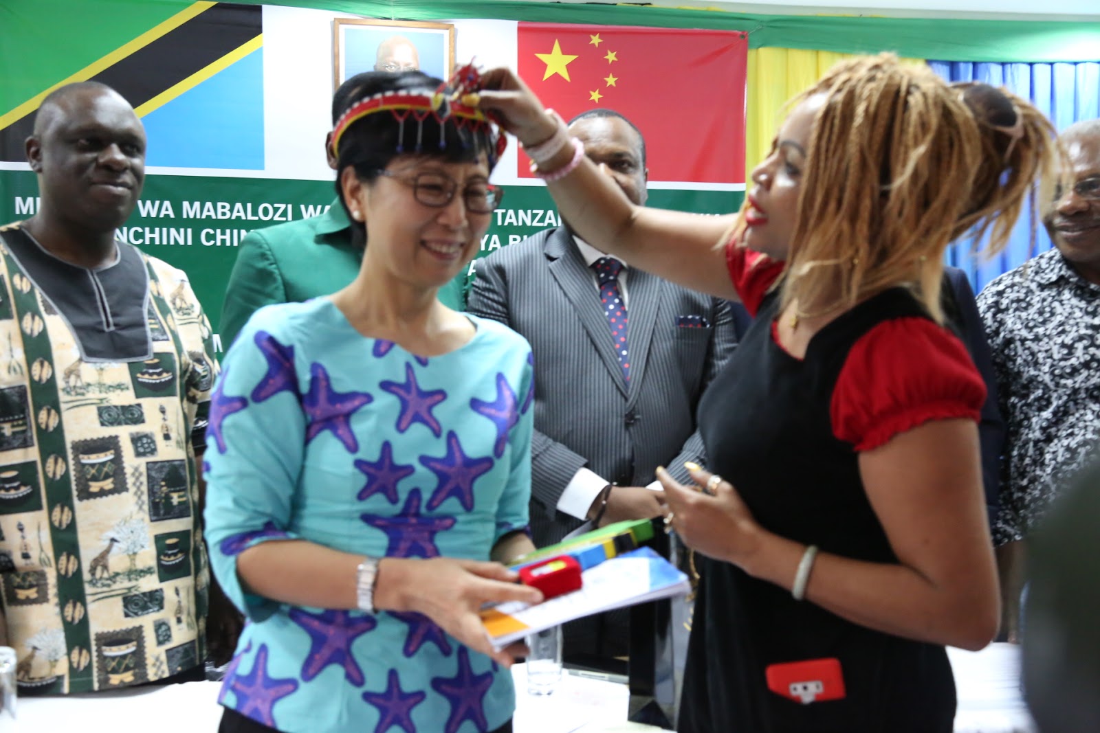 Balozi wa China nchini Tanzania akikabidhiwa zawadi kutoka kwa mfanyabiashara wa Madini. |