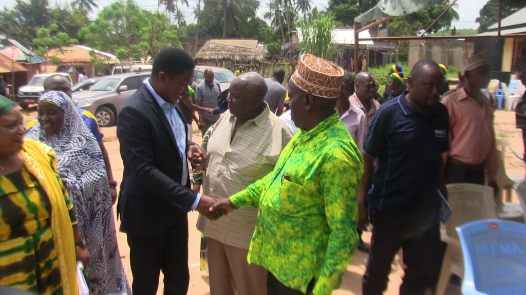 Waziri wan chi Ofisi ya Rais Tawala za mikoa na serikali za mitaa (TAMISEMI) Seleman Jafo ambaye pia ni Mbunge wa Jimbo la Kisarawe akisalimia na baadhi ya viongozi wa Chama cha mapinduzi CCM kata ya Msanga baada ya kuwasili katika eneo hilo akiwa katika ziara yake ya kikazi kwa ajili ya kuzungumza na wananchi na kukagua miradi ya maendeleo