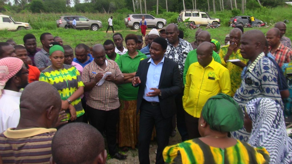 Waziri wan chi Ofisi ya Rais Tawala za mikoa na serikali za mitaa (TAMISEMI) Seleman Jafo ambaye pia ni Mbunge wa Jimbo la Kisarawe kulia akitoa maelezo kwa viongozi wa Chama cha amapinduzi CCM na baadhi ya viongozi wa halmashauri alipotembnelea mradi wa ujenzi wa kituo cha afya chole