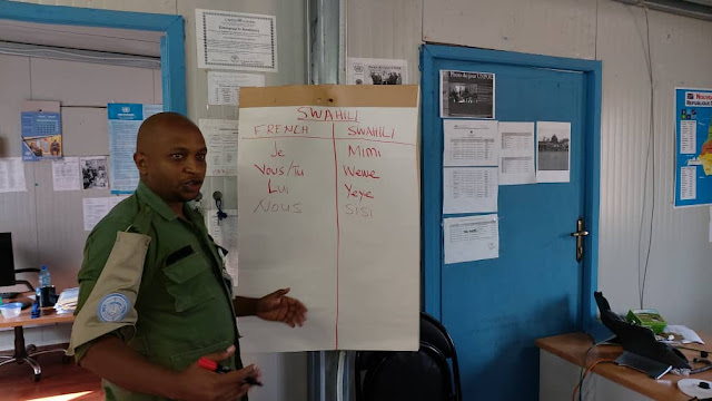 Askari polisi wa Tanzania anaeshiriki ulinzi wa Amani katika nchi ya kidemokrasia ya Congo Ally Babu akifundisha lugha ta kiswahili kwa walinzi wa amani wenzake kutoka nchi mbalimbali duniani.