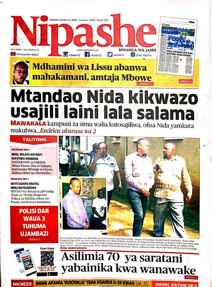 MagazetiPITIA VICHWA VYA HABARI KATIKA MAGAZETI YA LEO JANUARI 21,2020 Last updated: 2020/01/21 at 3:48 AM Alex Sonna 6 years ago Share SHARE Alex Sonna January 21, 2020 January 21, 2020 Share this Article Facebook Twitter Email Print Previous Article RASMI MTANZANIA MBWANA SAMATTA NI MALI YA ASTON VILLA YA UINGEREZA , SASA KUPEPETANA NA MIAMBA YA EPL Next Article WAZIRI KAIRUKI ATEMBELEA KIWANDA CHA KUBANGUA KOROSHO CHA SABAI MKURANGA