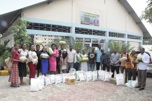 Youth of the Abundant Blessing Center (ABC) Church of Tabata Mandela in Dar es Salaam and Mandela Local Government officials in a joint photo before going to present assistance to 20 flood victims and vulnerable elderly people living in the area. On the right is the Archbishop of ABC Churches, Flaston Ndabila. They provided assistance during the training of community-based charity by Tamari Mwakakonyole Shunda who lives in the United States. PHOTO/DOTTO MWAIBALE.