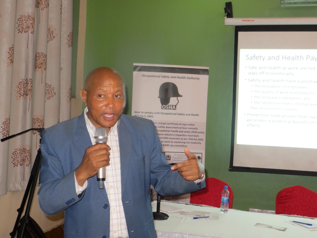 Mkurugenzi wa Mafunzo, Utafiti na Takwimu wa OSHA, Joshua Matiko, akiwasilisha mada katika semina kuhusu kampeni ya kutokomeza ajali na magonjwa mahali pa kazi